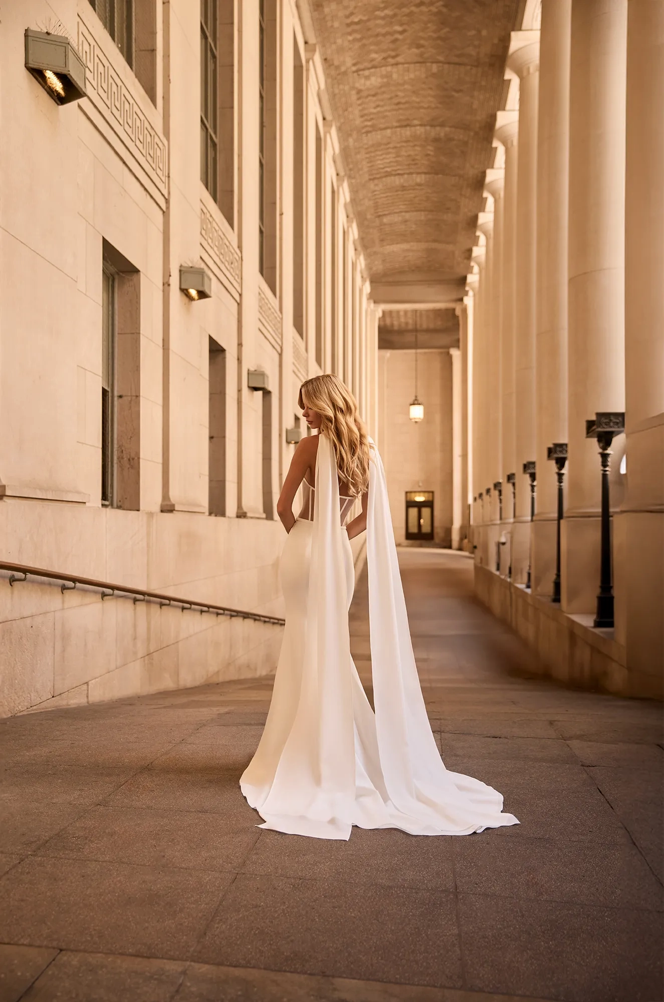 Asymmetric draped Crêpe bodice with straight across neckline and Natural Italian Tulle back bodice with exposed boning. Crêpe scarf. Fabric covered buttons down center back to waist. Crêpe band at waist. Draped Crêpe fit and flare skirt. Train length is 24"